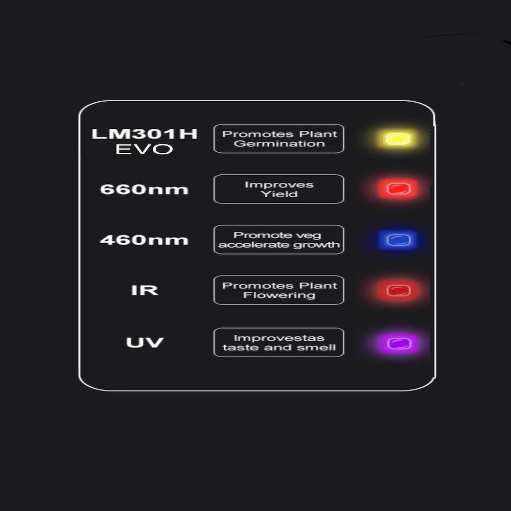 5 Farklı Çip Kombinasyonu: Samsung LM301H EVO, Kraliyet Mavisi (Royal Blue), Kırmızı (Red), Kızılötesi (IR) ve Ultraviyole (UV) çiplerin hibrit dizilimi.