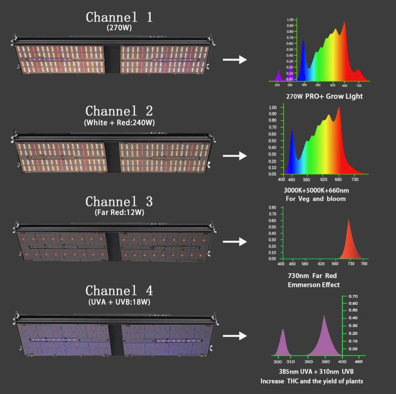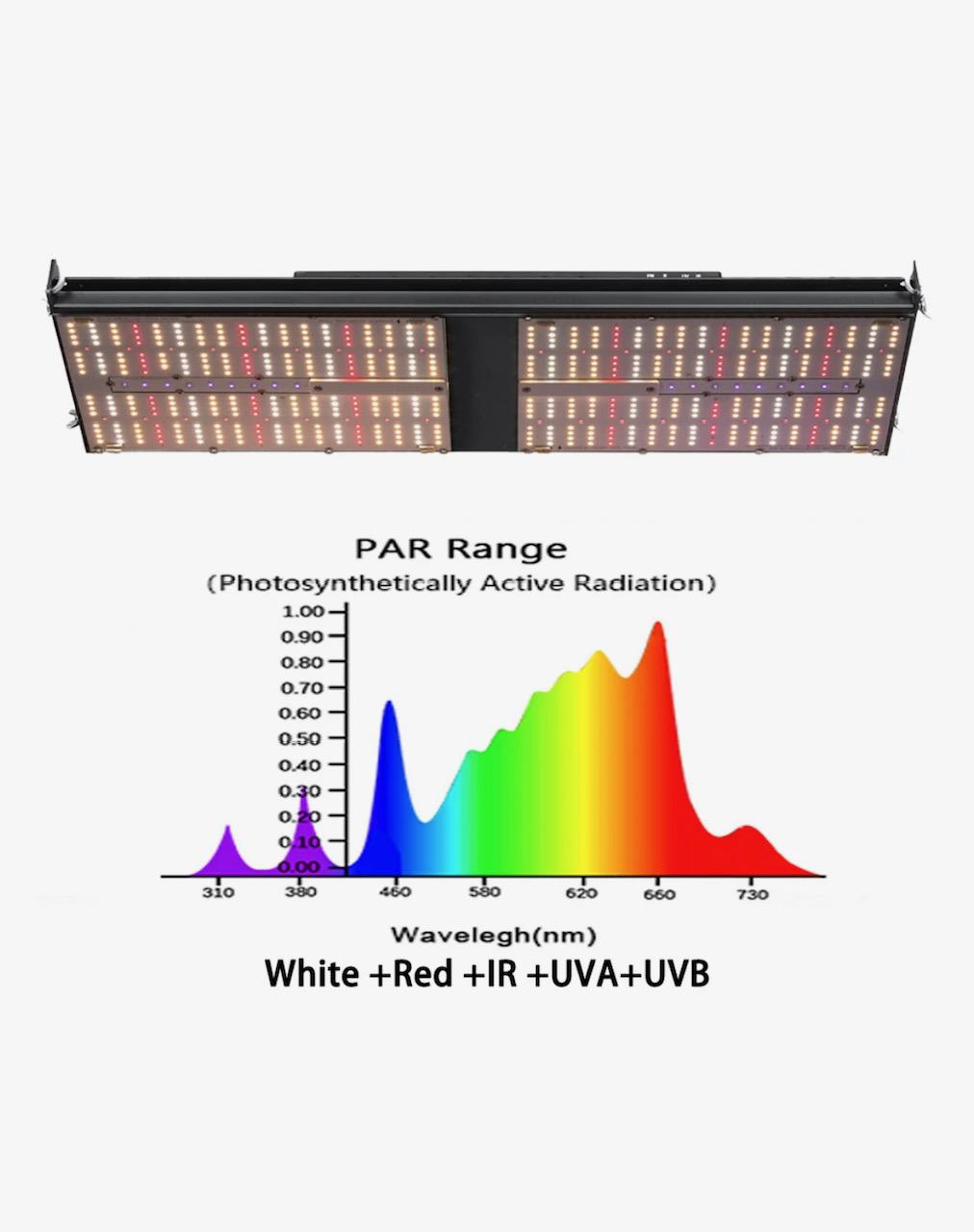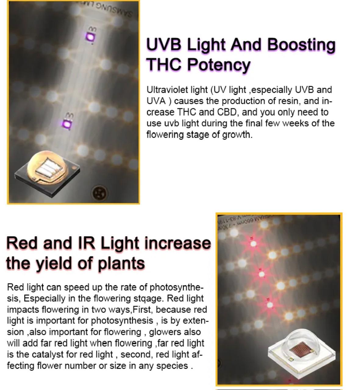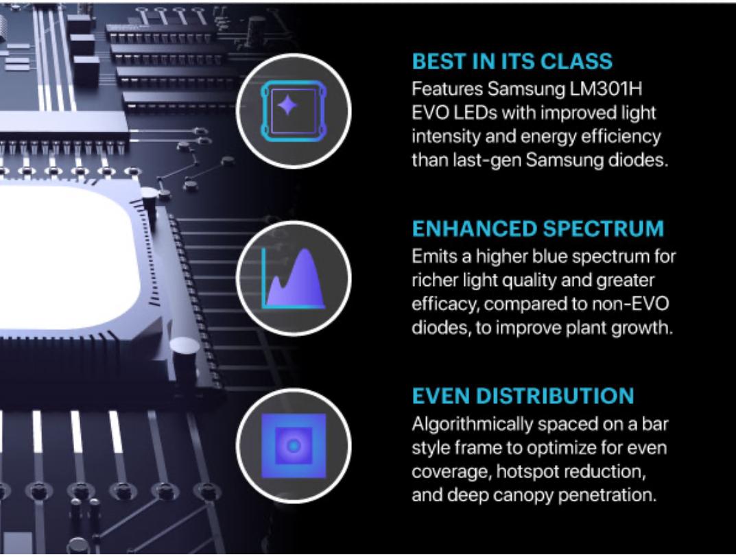 3000K ve 5000K karışımı Samsung LM301H EVO LED çipler ile donatılan bu lamba, bitkileriniz için mükemmel bir ışık spektrumu sunar. Ultra zenginleştirilmiş Osram kızılötesi (IR) ve Osram kırmızı çipler, bitkilerin çiçeklenme ve meyve verme süreçlerini en üst düzeye çıkarırken, UV-A ve UV-B LED'ler mahsul kalitesinde olağanüstü bir artış sağlar.